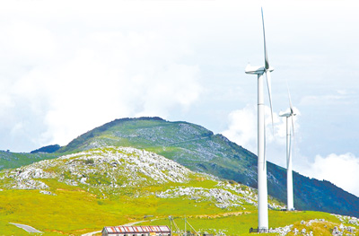 日本梼原町在海拔1000多米的高原上设置的两个600千瓦的风力发电组。
