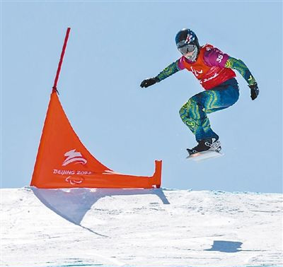 3月7日,澳大利亚代表团运动员在北京冬残奥会残奥单板滑雪男子障碍追逐LL2级比赛中。