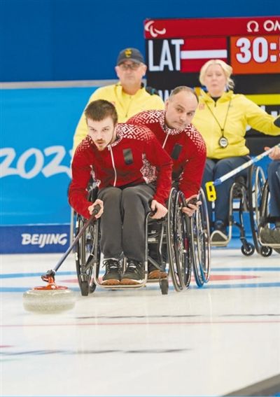 3月7日,在北京冬残奥会轮椅冰壶循环赛中,拉脱维亚队对阵瑞典队。
