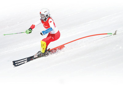 3月7日,中国代表团运动员张梦秋在北京冬残奥会残奥高山滑雪女子全能站姿组比赛中。