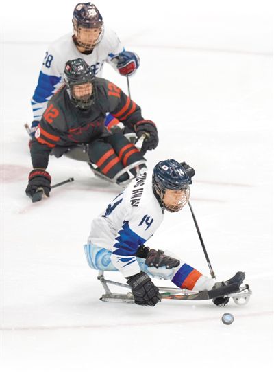 3月8日,北京冬残奥会残奥冰球小组赛在国家体育馆继续进行。图为加拿大队对阵韩国队。