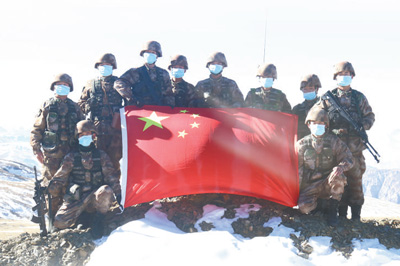 “里孜戍边模范连”官兵巡逻到达界碑前,向国旗宣誓并合影留念。