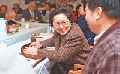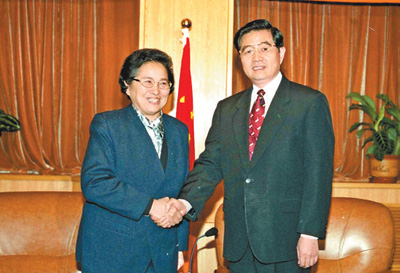 2002年12月23日,胡锦涛同志走访各民主党派时,与何鲁丽同志握手。