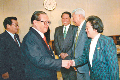 1997年1月1日,江泽民同志在北京会见民革中央新任主席何鲁丽同志。
