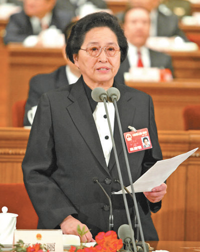 2003年3月11日,十届全国人大一次会议第四次全体会议在北京人民大会堂举行。何鲁丽同志主持会议。