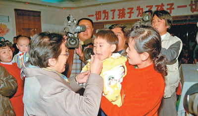 1995年12月5日,由卫生部组织的全国强化免疫活动日在中国各地举行,北京丰台区幼儿园举办为儿童喂服口服防疫药物的活动。这是何鲁丽同志为小朋友喂服防疫药物。
