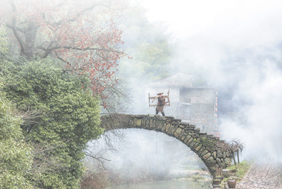 浙江省缙云县岩下村,始建于明代,因位于百丈岩下而得名。近年来,当地狠抓环境整治,挖掘古村文化,探索乡村游、生态游等特色产业,古村如今再度焕发活力。图为村民走过岩下村的封溪桥。
