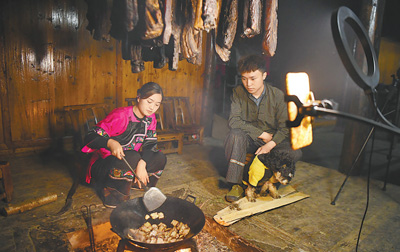 湖南省花垣县十八洞村,是武陵山区腹地的一个苗族聚居村。近年来,当地大力发展乡村旅游、果蔬种植等产业,民宿店主、短视频博主等乡村新职业不断涌现。图为返乡创业大学生施林娇(左)在直播炒腊肉。