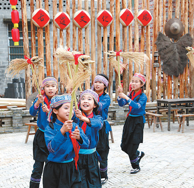 广西壮族自治区富川瑶族自治县岔山村,曾是深度贫困村。2016年起,岔山村整治村容村貌,推广特色美食,吸引村民返乡创业,2019年实现整村脱贫。图为小朋友们在文化广场舞草龙,体验古道文化传承。