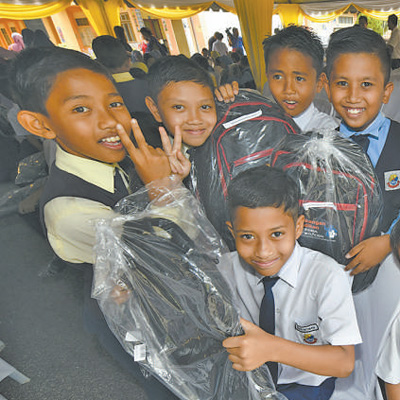 马来西亚马六甲州爱益仁耐国民小学的学生们收到中广核“埃德拉助学计划”送来的书包。