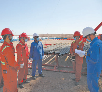 伊拉克米桑油田项目建设有力促进了当地配套产业发展,增进民生福祉。图为2021年9月,在米桑油田,中伊双方员工正在进行技术沟通。