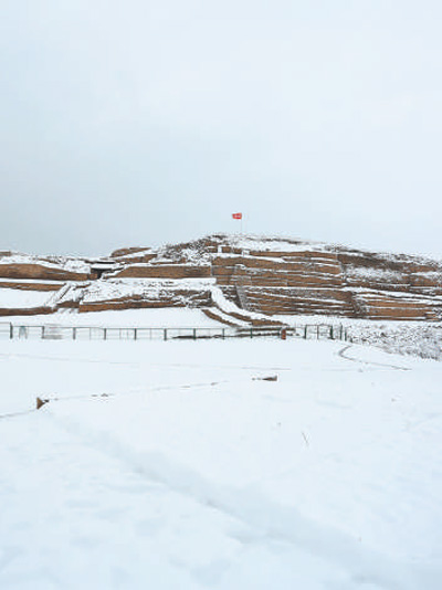 发掘半年,随着工作的有序进行,一波又一波的惊喜不期而至。2012年10月,我们对这里有了一个宏大的印象——这里,是4000年前的一座城的巨大城门。一方面,内外瓮城、南北墩台、门塾、门道以及两翼的马面、角台等城防设施,虽历4000年风雨,仍岿然矗立,向我们诉说着曾经的巍峨;另一方面,这里只是石峁城址的一座城门,还有更为壮阔的精彩正待我们去发现。那年冬天,滴水成冰、严寒异常,东门那面飘扬的鲜红队旗,映着大雪在凛冽的寒风中舒展张扬。