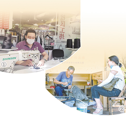 图①:中国社区商业工作委员会从2018年开始推动“社区工坊”综合性维修服务业态,目前已在南京、上海、合肥、北京等地落地。图为位于北京通州区“社帮帮”服务中心的社区工坊,陈师傅正在帮顾客改衣服。