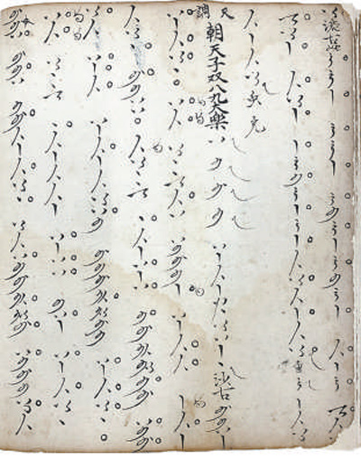 二是音位型曲谱,以各类符号指代乐器上的音位。使用这类曲谱,必须首先明确弦乐器的定弦、定品方式,管乐器的开孔标准和按孔、吹奏方法,才能确定每个音位的实际音高。正因如此,音位谱往往与乐曲宫调密切相关。同一份谱子,换用不同宫调演奏,音响大不相同。20世纪初,敦煌藏经洞曾发现一份五代时期的曲谱,采用20个琵琶音位符号记录,是目前已知这类曲谱的早期代表。