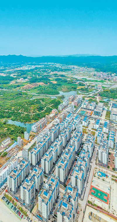 广西苍梧县老乡家园石桥集中安置小区,成排的易地搬迁安置房与远处的青山构成了一幅秀美图画。