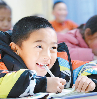 青海格尔木市长江源民族学校的学生在上课。格尔木市长江源村是从唐古拉山上易地搬迁下来的移民新村,搬迁后,孩子们上学更便利了,生活条件也更好了。