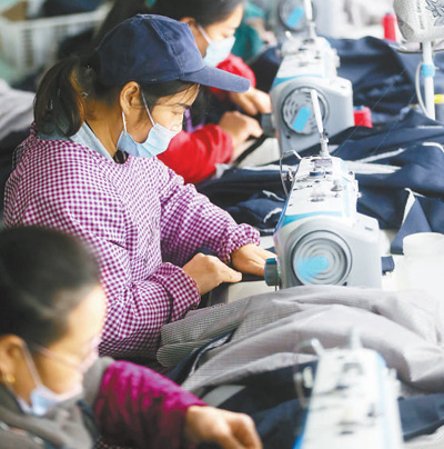 重庆黔江区城南街道李家溪易地扶贫搬迁安置点的服装厂,脱贫群众在制作服装。