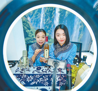 贵州兴义市洒金街道易地扶贫安置区内,居民李臣娣(左)在直播销售当地出产的果酒。