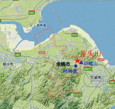 井头山遗址位于浙江省余姚市东部三七市镇一个叫井头山(海拔72米,属四明山余脉)的小山头南麓。2013年下半年,在河姆渡文化田螺山遗址发掘过程中,考古工作者偶然获得附近地下深处透露出的贝丘信息。经过深入调查,饱含大量海生贝类动物壳体的文化层埋藏深度竟达6至10米,经碳十四测定,年代距今达8000多年,足足早于闻名中外的河姆渡文化1000多年!