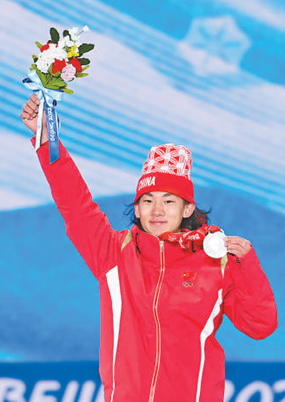 2月7日,苏翊鸣在奖牌颁发仪式上。