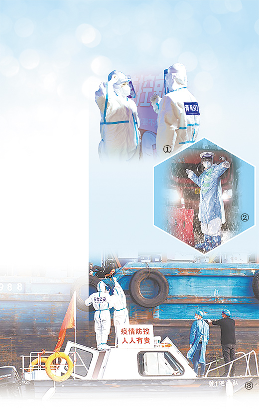 图③:江苏省东台市公安局党员民警和社区党员干部、医护人员组成水上党员服务队,登船采集核酸样本。