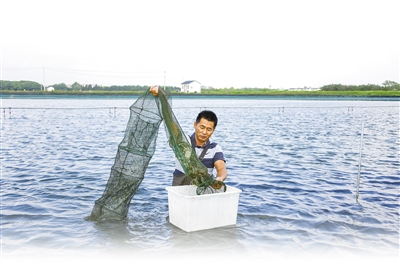 昆山市巴城镇联民村村民邹建星在捕捞螃蟹。