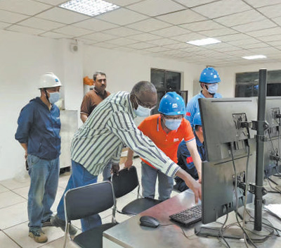 埃塞俄比亚贝雷斯1号糖厂项目煮糖车间中,中方工程师(左四)向当地工程师讲解车间控制逻辑。