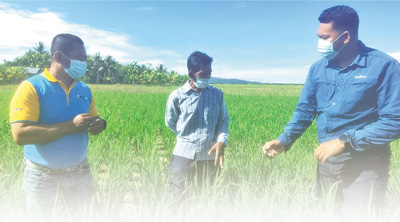 印度尼西亚西加里曼丹省萨姆巴斯县,当地农民和先正达集团的农艺师(右一)正在查看交流水稻长势。