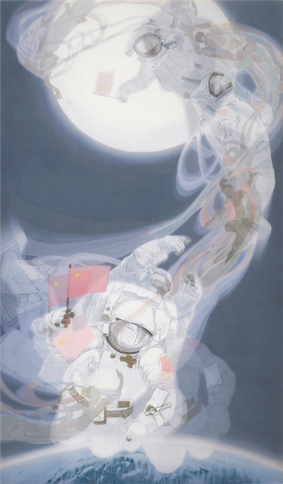 一些作品在创新表达中体现出善于转化的艺术智慧。比如,范春晓中国画《中国制造走向世界——C919大飞机》,在对比各种创作视角后,最终选取飞机在总装车间的正面视角,利用对称式构图,将多种制造工序融汇于同一画面中,较为全面深入地展现了C919的研制历程。精细有致的工笔画法营造出紧张有序的画面节奏,以中国传统审美情趣,彰显大飞机承载着几代中国人梦想的深意。安佳、夏荷生、赵云川等人创作的中国画《飞天圆梦》,则以三联画的形式,将数位航天英雄巧妙组合在一个画面中。深蓝色的太空、航天员淡定而坚毅的神情,既展现出我国日益进步的载人航天技术,又体现了中国航天人的精神和意志。作品在表达自信、豪迈之余,又不失情怀与诗意。在美术工作者创造性的艺术转化和思想表达中,各不相同的创新成果均得到较好呈现,在艺术趣味的表达、审美品位的提升等方面有明显进步。