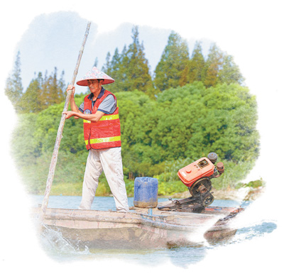 图为陈士明正在六干河水域巡江,清理水面垃圾。