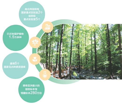 南北两园现有国家重点实验室2个、省部级重点实验室5个,建有牡丹、睡莲、野生蕨类植物等6个国家花卉种质资源库,拥有亚洲最大的植物标本馆、馆藏标本280万份。
