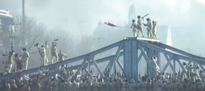 图为电影《大决战》中《平津战役》我军胜利会师天津金汤桥场景。