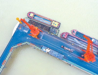 长江和鄱阳湖交汇处的江西省九江市湖口县,码头正在桥吊作业。