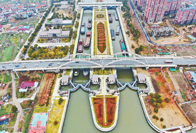 江苏省南通市,连申线(连云港至上海)航道上的船舶陆续通过海安船闸。