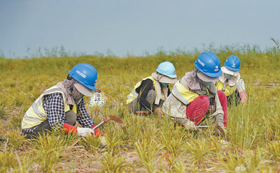 工人在雄安新区藻苲淀退耕还淀湿地恢复工程项目区内清理杂草。