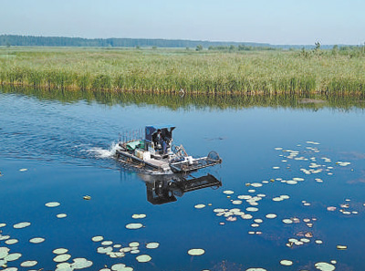 一艘打捞船在河北雄安新区白洋淀景区内清理漂浮物。