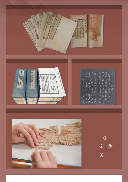 图④:修复师正在进行古籍修复。