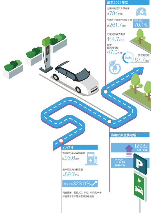 中国电动汽车充电基础设施促进联盟最新统计数据显示,2021年,公共充电桩新增34.0万台,公共充电基础设施增量同比上涨89.9%。截至2021年底,已建成公共充电桩114.7万台,同比增长42.1%。其中直流充电桩47.0万台、交流充电桩67.7万台。2021年,月均新增公共类充电桩约2.83万台。与此同时,我国换电站数量快速增长,由2020年底的555座,提升至2021年底的1298座。