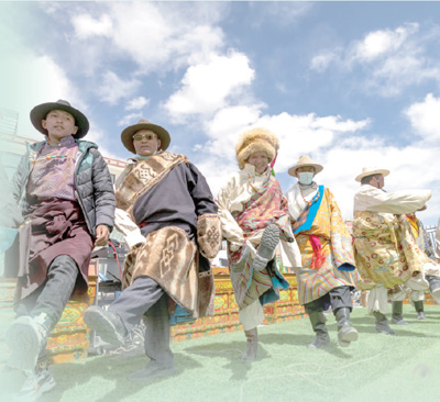锅庄舞是一种藏族传统舞蹈形式,在藏语中意为圆圈歌舞。图为普兰县“玛旁雍错旅游文化节”上,当地群众身着节日盛装,跳起锅庄舞。