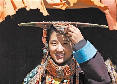 科迦村最具代表性的普兰“宣”服饰,目前保存完好的仅有8套,一套重达20多公斤,是国家级非物质文化遗产。图为当地妇女穿着普兰“宣”服饰。