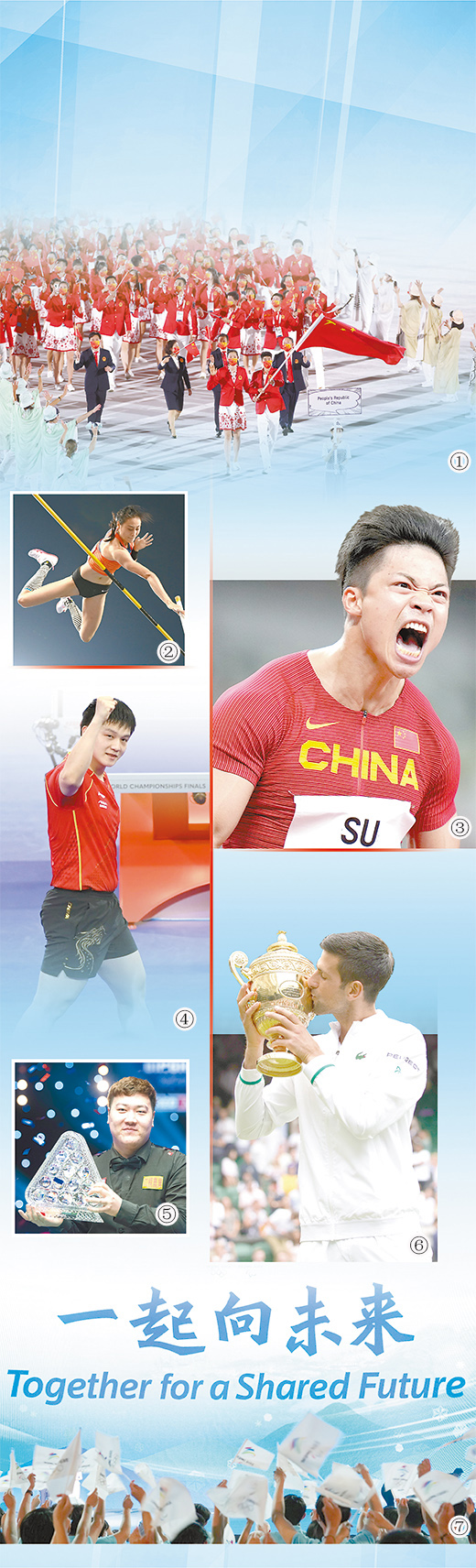 当地时间1月17日,20岁的颜丙涛在英国举行的斯诺克大师赛上夺冠(图⑤),成为斯诺克“三大赛”(世锦赛、英锦赛、大师赛)历史上第一位00后冠军。当地时间12月5日,24岁的赵心童在英国举行的斯诺克英锦赛上夺得冠军。北京时间11月16日,一级方程式(F1)阿尔法罗密欧车队宣布,22岁的中国车手周冠宇正式加盟该车队,成为中国首位世界一级方程式赛车车手,他将作为正赛车手征战2022赛季。