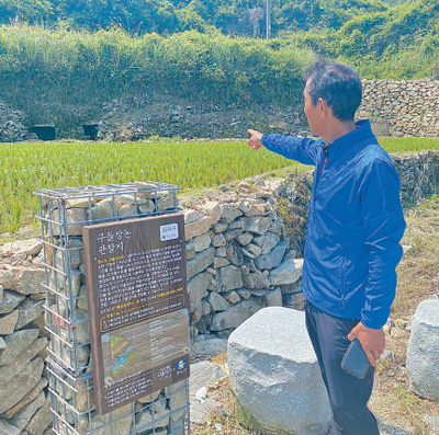 韩国青山岛炕板石田保护协会会长朴根浩正在介绍炕板石田构造。