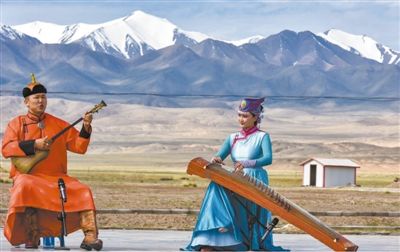初夏的甘肃肃北蒙古族自治县盐池湾乡,乌兰牧骑文艺小分队正在表演器乐弹唱。