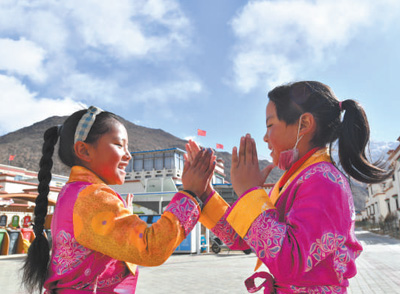 两名搬迁牧民家的小姑娘在西藏拉萨市堆龙德庆区古荣镇荣玛高海拔生态搬迁点做游戏。