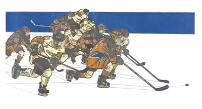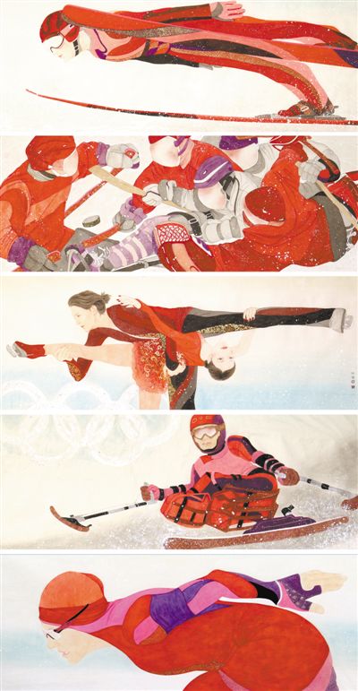 竞技体育,是“力与美”的交响。它在运动员身上体现出传统与现代、理性与感性等因素的综合运用,诸如最佳的空间位置、最恰当的能量安排、最具智慧的战略战术、最坚韧不拔的意志毅力等,彰显的正是竞技体育的“美”。而竞技体育题材美术创作,正是将美术的“美”——有序的节奏、情感的高潮、视觉的冲击力与感染力,与竞技体育的“美”充分融合起来,使之超越单纯的视觉美感,直达精神的世界。师璠中国画《冰雪之炎》便描绘了冰天雪地里燃烧的中国力量。作品将5个冰雪运动场景组合在一起,以工笔重彩技法加以描绘,并恰当运用传统勾金方式,通过红色与金粉的巧妙搭配,强化冰雪运动之美和赛场上青春飞扬的热度。