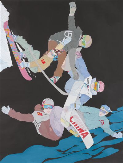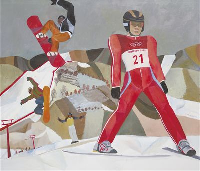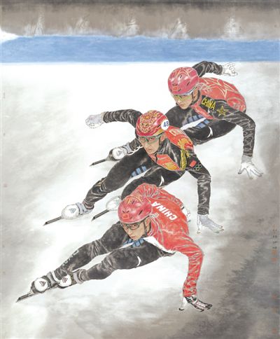 美术工作者观看体育赛事后,往往有感而发,对赛场上的精彩瞬间进行艺术化的提炼升华。不论是对运动员夺冠高光时刻的描绘,还是对体育精神的抒写,美术工作者皆以充满现代感的审美形式,刻画中国运动员的奋进姿态。这在北京冬奥会主题美术创作中得到清晰体现。在“生命之光·2022第九届中国北京国际美术双年展”和“天地人和——中国国家画院2022北京冬奥主题美术·书法作品展”上,一批竞技体育题材新作成为亮点。像高毅、黄华三中国画《巅峰舞雪》、于文江中国画《速度与激情》,皆通过运动员挑战极限的瞬间特写,在矫健身姿和单纯背景的对比中,抒写冰雪运动激情。