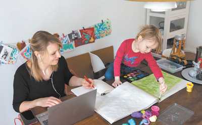 疫情防控期间,德国柏林的一对母子在家中远程上班和学习。