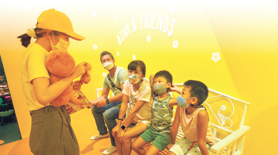 在新加坡一家购物中心,家长陪同孩子在游戏体验馆做游戏。