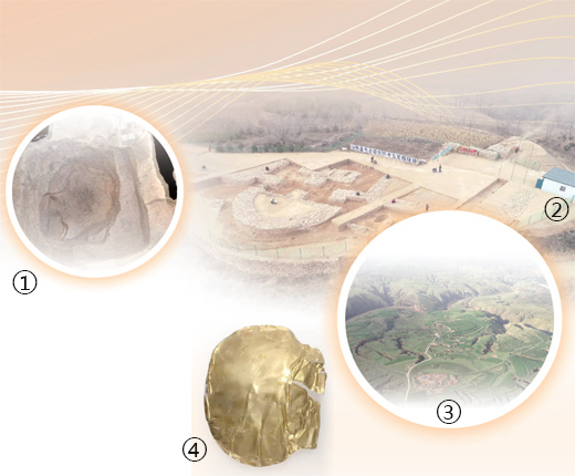 图④:河南郑州商都书院街商代墓地出土的金覆面。
