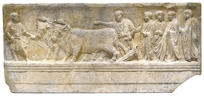 展览展示了罗马政治和文化变革在行政方面的体现,以及土地开发、城市和公共基础设施的建立情况等,呈现出古罗马时代城市规划的变迁。建城仪典浮雕是一幅大型叙事浮雕的残迹,描绘了耕作场景,浮雕的其他部分业已遗失。浮雕上一对耕牛套着挽具,头戴饰带并涂有三角形的额前纹,一个身穿古罗马短袍、头戴花冠的人正牵引着它们。另有一人同样着短袍紧随其后,左手举起犁刀以防破坏耕地,右手示意其他人继续前行。他的右边跟着4个身着宽袍的男人,可能是当地的行政官或社区的要人。图像再现了通过犁地划定一座新建城市边界的仪典场景。